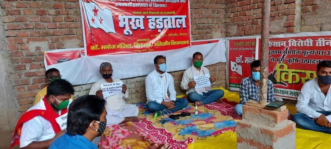 माले विधायक दल उपनेता सत्यदेव राम ने सिवान के दरौली, सचेतक विधायक अरुण सिंह ने काराकाट के अलावा घोषी विधायक रामबली सिंह ने जहानाबाद, महानंद प्रसाद ने अरवल, सुदामा प्रसाद ने तरारी, मनोज मंजिल ने अगियाँव, अजित कुशवाहा ने डुमराँव, अमरजीत कुशवाहा ने मैरवां तथा वीरन्द्र गुप्ता ने सिकटा विधान सभा क्षेत्र मुख्यालयों पर अनशन / भूख हड़ताल में शामिल हुए।