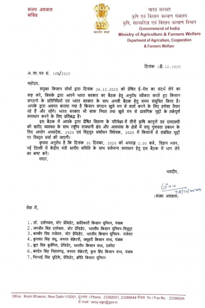 इस प्रस्ताव का जवाब देते हुए कृषि सचिव संजय अग्रवाल ने किसान संगठनों को लिखे एक पत्र के जरिए उन्हें राष्ट्रीय राजधानी के विज्ञान भवन में 30 दिसंबर को दोपहर दो बजे वार्ता करने का न्योता दिया है।