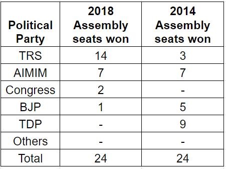 नीचे दी गई तालिका में दर्शाया गया है कि 2014 और 2018 के चुनावों में जीएचएमसी के अंतर्गत आने वाले 24 विधानसभा क्षेत्रों में विभिन्न राजनीतिक दलों का प्रदर्शन किस प्रकार रहा था।
