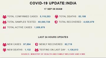 - न्यूज़क्लिक टीम17 Sep 2020दिल्ली: स्वास्थ्य मंत्रालय द्वारा आज 17 सितंबर सुबह 8 बजे जारी आंकड़ों के अनुसार